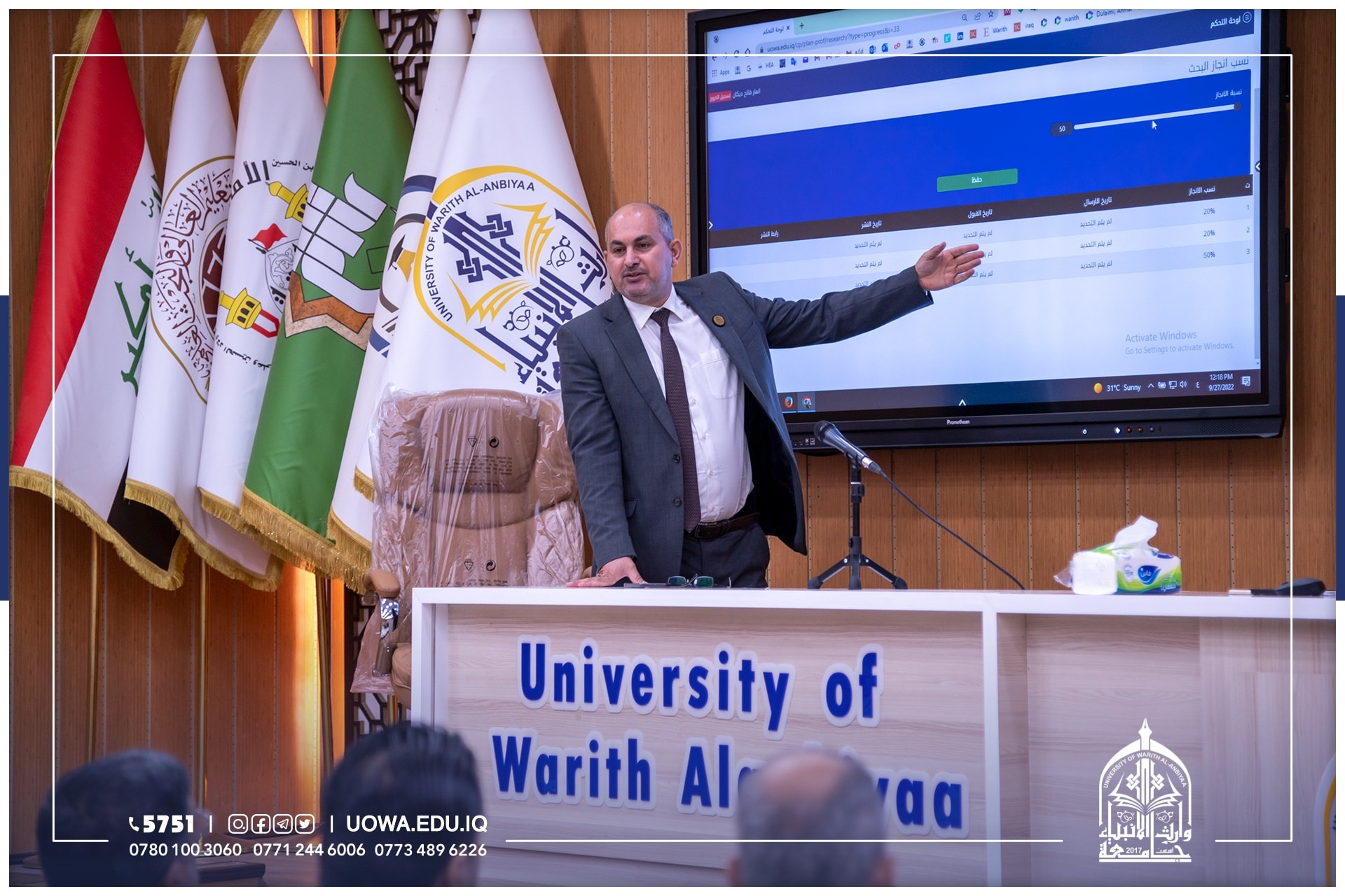 حيث قدم رئيس قسم الشؤون العلمية الاستاذ المساعد الدكتور انمار فالح ديكان ورشة عمل لعمادة كليتي الهندسة والقانون عن المنصة، قدم فيها شرحا مفصلاً عن آلية العمل في المنصة والتسجيل فيها وكيفية اضافة البحوث العلمية ونسب الانجاز بالإضافة الى الورش التي يروم التدريسي تقديمها وغيرها من المميزات لحوكمة الخطة العلمية في الجامعة.