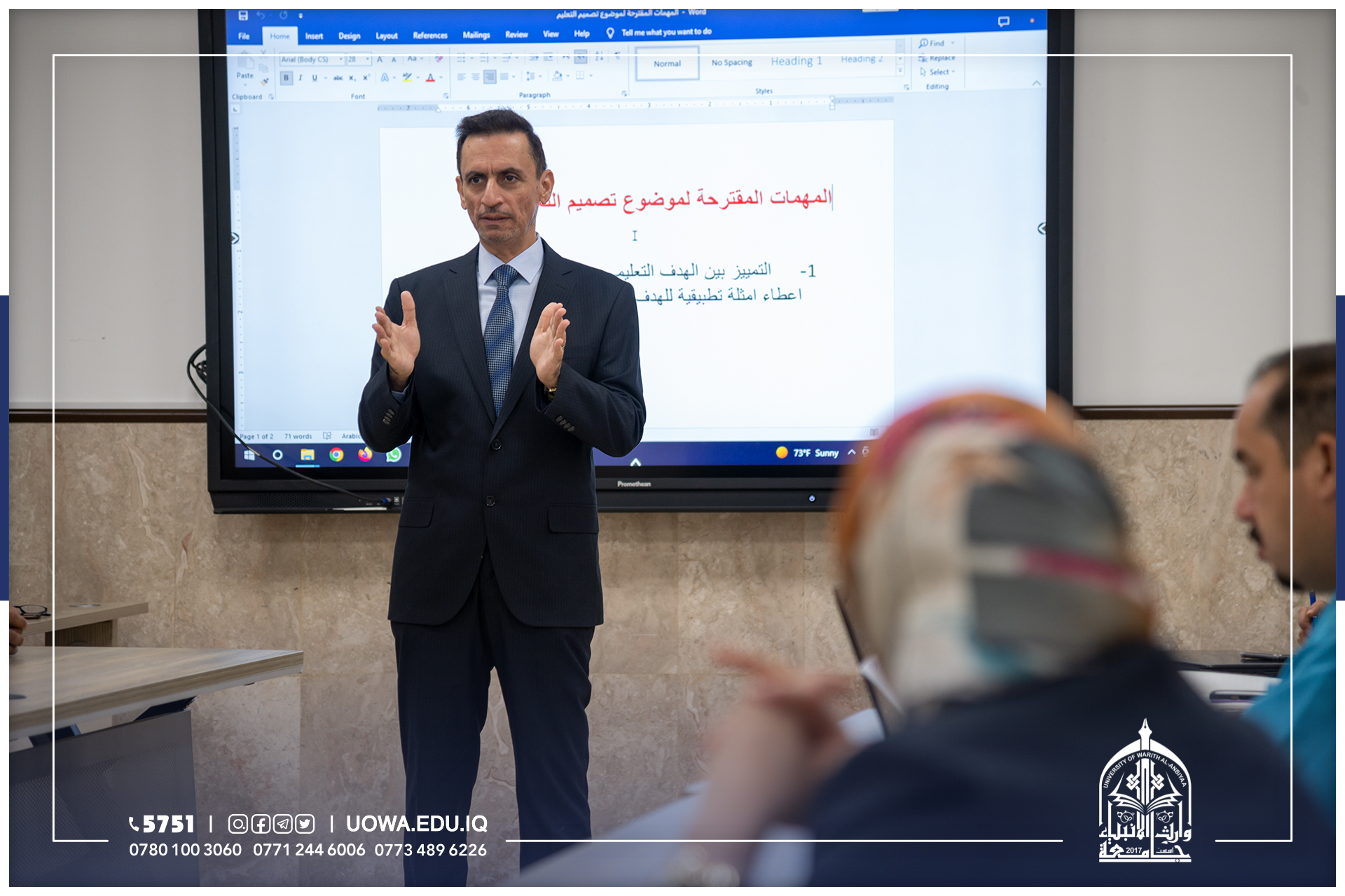 بالصور... استمرار الورش العلمية لتدريب وفد وزارة التعليم العالي والبحث العلمي على يد خبراء مشروع تحديث مناهج دورات طرائق التدريس في الجامعات العراقية، في رحاب جامعة وارث الانبياء(عليه السلام).