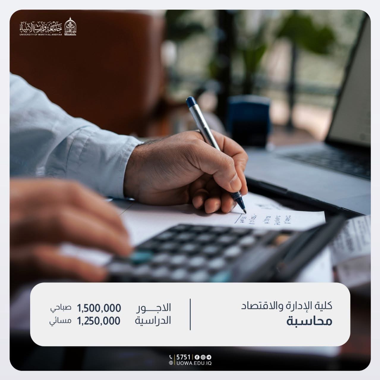 هنا في جامعة وارث الأنبياء – حيث نُخرّج محاسبين محترفين يمتلكون المعرفة النظرية والأسلوب العملي، القادرين على تحليل البيانات المالية، والمساهمة في دعم الأعمال والمؤسسات وفق المعايير الحديثة.