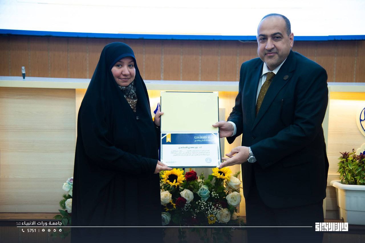 كرّم السيد عميد كلية العلوم الإسلامية في جامعة وارث الأنبياء (عليه السلام) الدكتور طلال فائق الكمالي، الدكتورة نور مهدي الساعدي، مدير شعبة ضمان الجودة في الكلية، تثمينًا لجهودها المتميزة في إكمال متطلبات الاعتماد المؤسسي وفق معايير الجودة الأكاديمية المعتمدة.