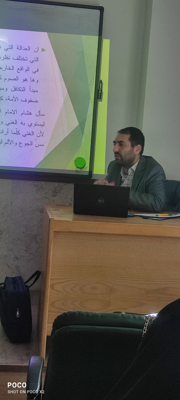 واستهدفت الورشة طلبة كلية العلوم الإسلامية، وقدّمها م.م مرتضى محمد علي آل تاجر، متناولًا مفهوم العدالة في الإسلام بشقّيها المادي والمعنوي، ودور التشريعات الإسلامية في ترسيخ العدالة والمساواة وصون الحقوق الإنسانية.