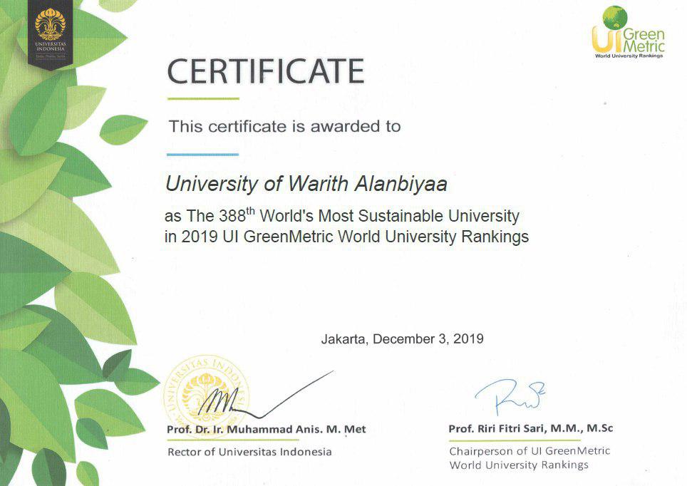 دخلت الجامعة في تصنيف GreenMetric العالمي للجامعات، حيث احتلت جامعة وارث الأنبياء (عليه السلام) المرتبة 388 من أصل 780 جامعة مصنفة عالمياً والمرتبة 6 من اصل 44 جامعة مصنفة محلياً ، يأتي هذا الإنجاز بعد متابعة حثيثة ومستمرة لمتطلبات هذا التصنيف وأكمالها على اتم وجه خدمةً للعملية التعليمة في البلد ، يذكر ان جامعة وارث الانبياء(عليه السلام) قد دخلت في وقتٍ سابق في عدد من التصنيفات العالمية والمحلية سعياً منها للنهوض الجدي بالواقع العلمي في البلد .