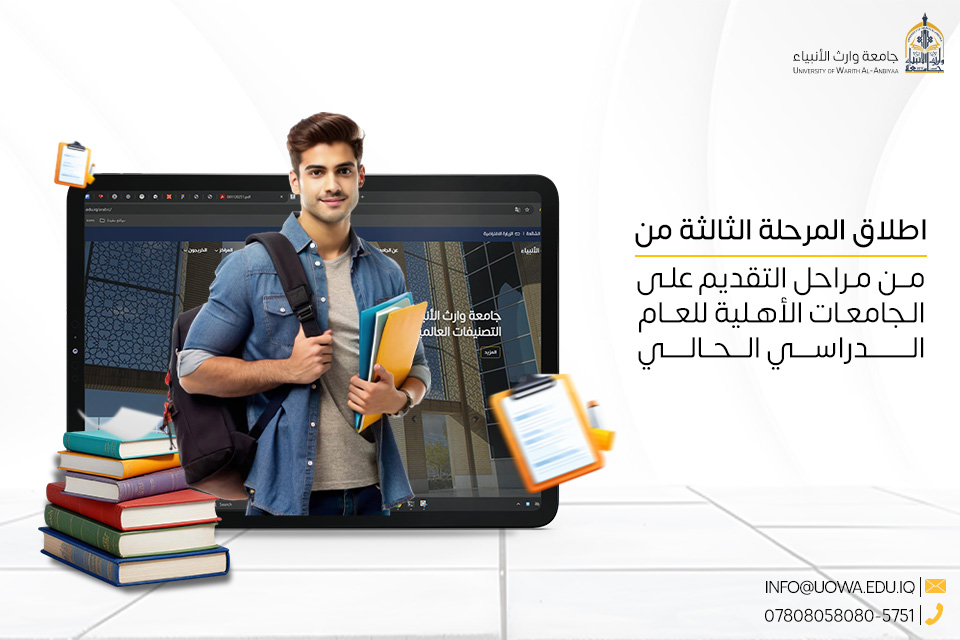 تعلن وزارة التعليم العالي والبحث العلمي فتح استمارة التقديم الإلكتروني لقبول الطلبة من خريجي الإعداديات الإسلامية التابعة لوزارة التربية ومدارس الوقفين (الدور الثالث) للسنة الدراسية 2026/2025.