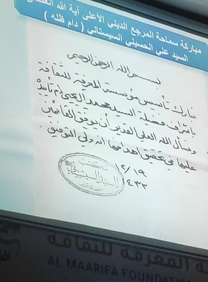 يذكر أن "جمعية المعرفة للثقافة" تحضى بمباركة المرجع الديني الاعلى سماحة السيد علي الحسيني السيستاني (دام ظله)
