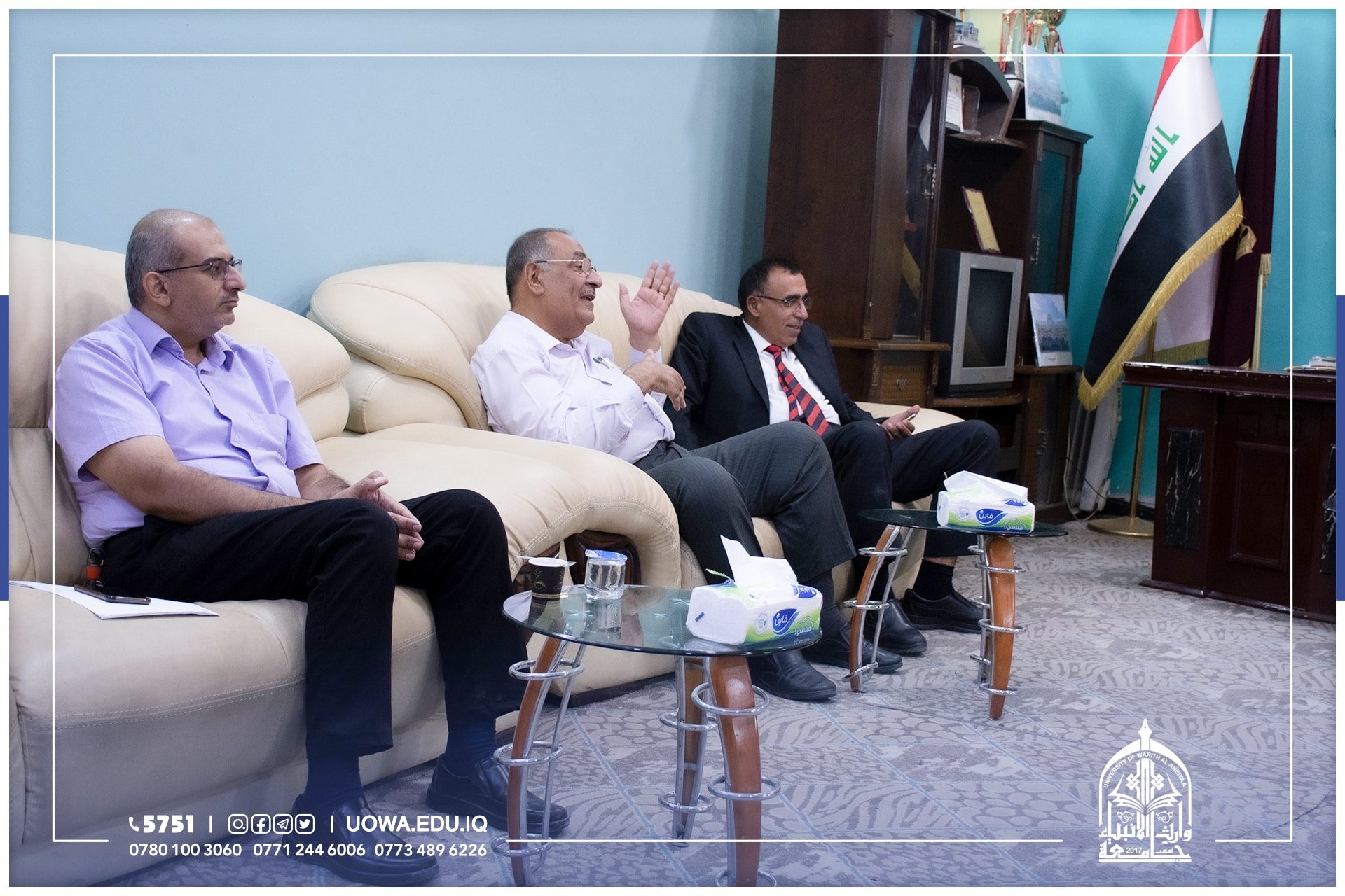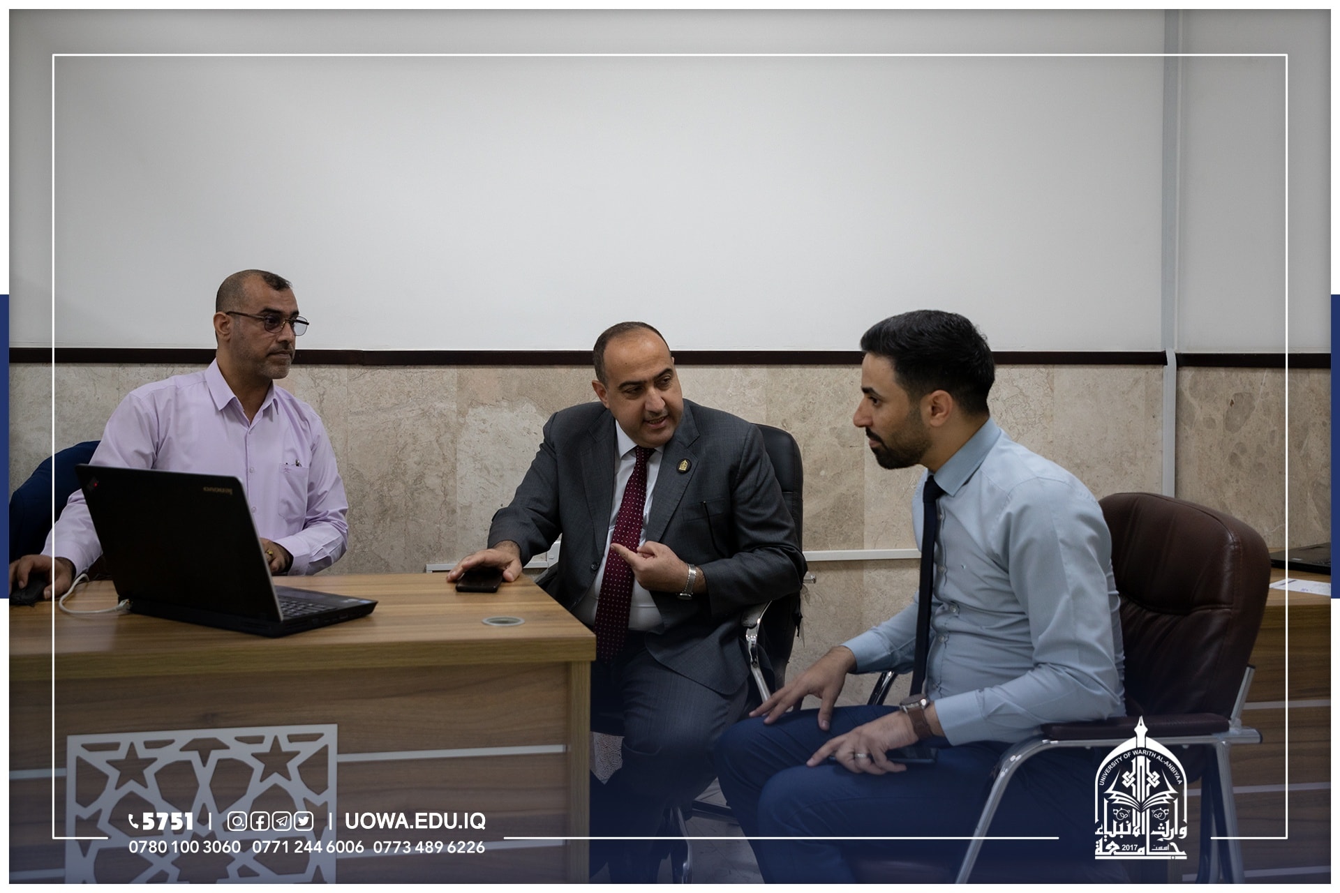 اجتمع السيد رئيس الجامعة الاستاذ الدكتور ابراهيم الحياوي بالبروفيسور حسن النجم رئيس مركز تطوير المواد الانشائية في جامعة ليفربول جون مورس البريطانية والسيد عميد كلية الهندسة الدكتور حسين هادي والسيد رئيس قسم الشؤون العلمية والسيد رئيس قسم ضمان الجودة