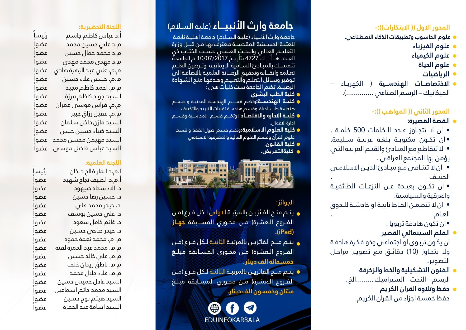 جامعة وارث الانبياء(عليه السلام) تستعد لاطلاق جائزتها الاولى لطلبة الدراسة الاعدادية في مدينة كربلاء المقدسةبتوجيه من المتولي الشرعي للعتبة الحسينية المقدسة سماحة الشيخ عبد المهدي الكربلائي(دام عزه) وبرعاية السيد رئيس الجامعة الاستاذ الدكتور ابراهيم الحياوي وبالتعاون مع المديرية العامة لتربية محافظة كربلاء المقدسةتستعد الجامعة لاقامة (جائزة وارث الانبياءللموهوبين والمبدعين في المدارس الثانوية )تحت شعار" برعاية الموهوبين والمبدعين نصنع مستقبل افضل لاجيالنا" في الخامس عشر من اكتوبر المقبل وذلك ايماناً من رئاسة الجامعة بأهمية دعم الطلبة الموهوبين باعتبارهم اللبنة الاساسية في بناء جيل واعٍ ومتسلح بالعلم، وللارتقاء بالمستوى العلمي ورعاية الطلبة الذين يمتلكون الموهبة والابداع.