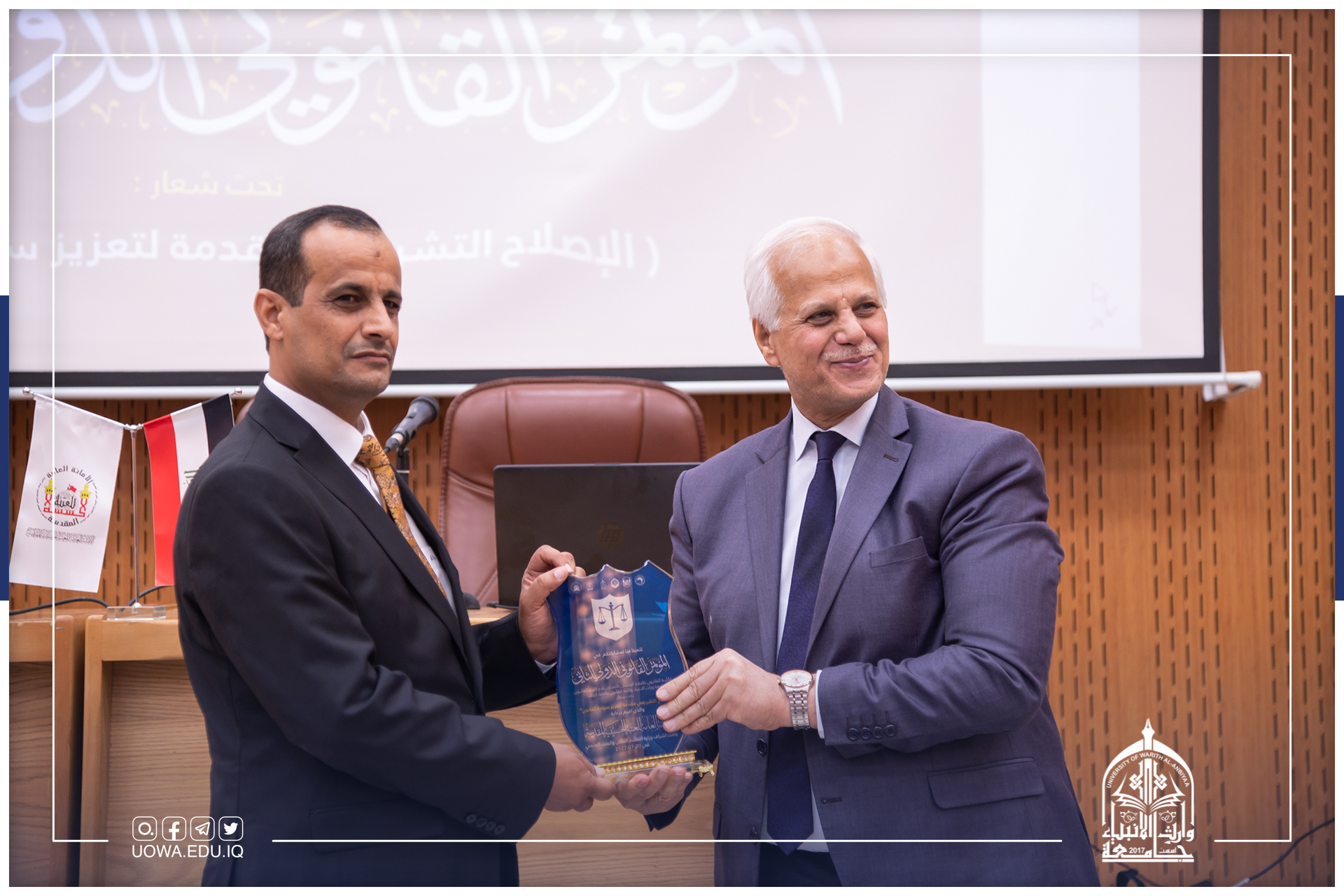 برعاية الامانة العامة للعتبة الحسينية المقدسة وتحت اشراف وزارة التعليم العالي والبحث العلمي اقامت كلية القانون في جامعة وارث الانبياء (عليه السلام ) المؤتمر الدولي الثاني بالتعاون مع كلية القانون في جامعة كربلاء وكلية القانون في جامعة المثنى، على رحاب القاعة المدرجة في بناية العصمة وبحضور رئيس هيئة التعليم الجامعي في العتبة الحسينية المقدسة الاستاذ الدكتور حيدر التميمي والاستاذ الدكتور ابراهيم سعيد الحياوي رئيس جامعة وارث الانبياء (عليه السلام) وممثلاً عن مجلس النواب العراقي وعدد من الشخصيات العلمية والأكاديمية.