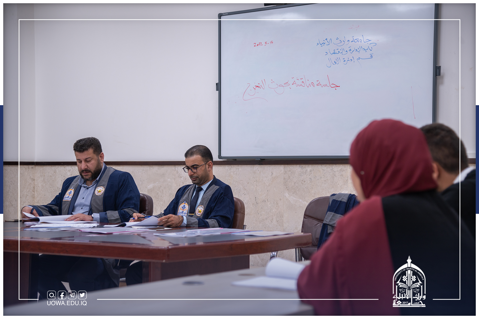 بحضور لجنة علمية مشكلة من قبل عمادة كلية الادارة والاقتصاد للإشراف على المناقشات، عقد قسم ادارة الاعمال جلسة خاصة لمناقشة بحوث التخرج لطلبة المرحلة الرابعةوتضمنت هذه البحوث مواضيع تناولت احتياجات المجتمع في سوق العمل كالسياحة وادارة المشاريع وغيرها من المواضيع التي قدمها الطلبة باشراف اساتذة القسم. يذكر أن جامعة وارث الانبياء(عليه السلام) قد أعدت برنامجاً مكثفاً لطلبة المرحلة الرابعة لتخريج طلبة يتقنون تخصصهم ويمتلكون المهارة الكافية للانخراط في سوق العمل.