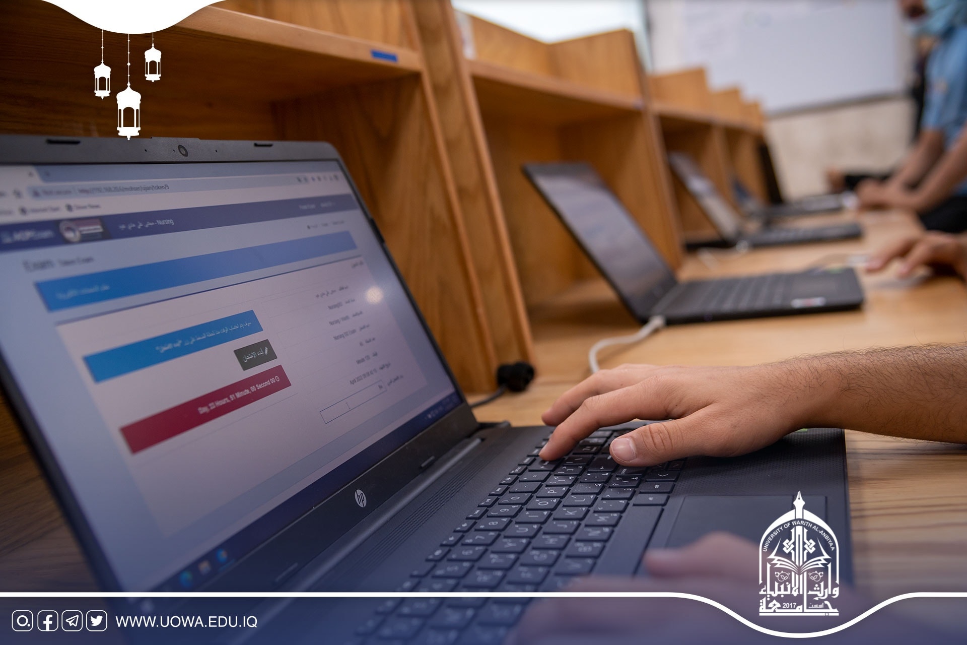 بإشراف السيد رئيس الجامعة الاستاذ الدكتور ابراهيم الحياوي والسيد المساعد العلمي الاستاذ الدكتور عباس الدعمي والسيد عميد كلية التمريض أ.م.د مرتضى الجبوريوبالتعاون مع مركز الحاسبة الالكترونية وشعبة التعليم الالكتروني في الجامعة أجرت كلية التمريض الامتحان التجريبي للاستعداد للامتحان التقويمي الوزاريحيث أدى الطلبة الامتحان بعد استلام الاسئلة الوزارية من قبل عميد الكلية الاستاذ المساعد الدكتور مرتضى الجبوري والفريق الالكتروني للجامعة الذي بدوره وزع الاسئلة على الطلبة، وتابع الفريق الوزاري من خلال المنصة الالكترونية المخصصة للامتحان التجريبي سير العملية الامتحانية داخل الكلية من خلال الدخول الى القاعات الامتحانية والتحدث مع رئيس الجامعة وعميد الكلية، والمراقبين الموجودين هناك ،وقد أشادوا بالتنظيم العالي الذي أقامته الكلية لأداء الامتحان.يذكر أن جامعة وارث الانبياء (عليه السلام) قد جهزت مسبقاً ثمانية مختبرات علمية بأحدث الوسائل التعليمية الحديثة.