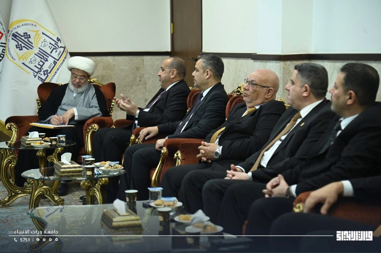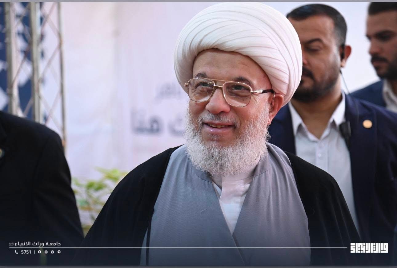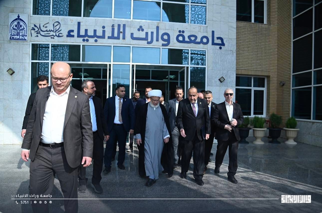 His Eminence Sheikh Abdul Mahdi Al-Karbalai, visited Warith Al-Anbiyaa University today. He was received by the University President, Professor Dr. Ibrahim Saeed Al-Hayawi, to conduct an inspection tour and review the ongoing expansion and development projects within the university.