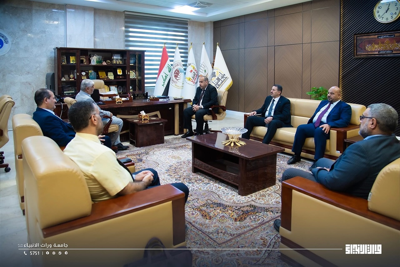 Within the framework of academic openness and strengthening cooperation between educational institutions, the President of Warith Al-Anbiya University, Professor Dr. Ibrahim Saeed Al-Hayawi, and the Dean of the College of Medicine, Professor Dr. Ali Abdul Saadoun, received a delegation from Hammurabi College of Medicine – University of Babylon, headed by the Dean of the College, Professor Dr. Hadi Al-Moussawi, in an official scientific visit during which a joint cooperation agreement was signed between the two sides. The agreement aims to develop the fields of medical education, scientific research, clinical training, and the exchange of academic expertise between the two colleges, thereby contributing to raising the level of medical education in Iraq and providing an integrated scientific environment that supports innovation and research.