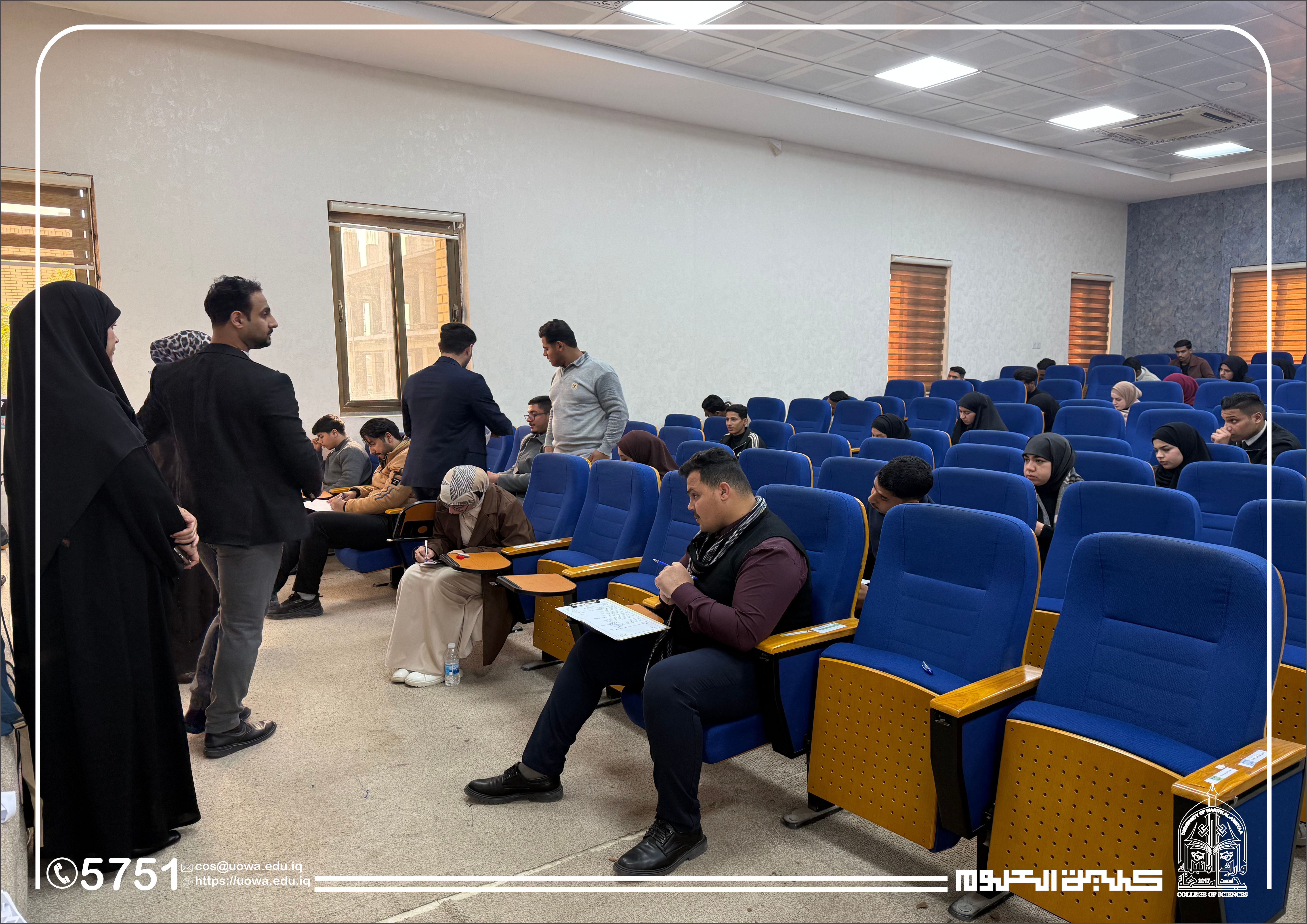 In the context of his continuous follow-up of the academic process and his commitment to providing an appropriate examination environment, the Dean of the College of Science at Warith Al-Anbiyaa University (peace be upon him) conducted an inspection tour of the examination halls to monitor the progress of the midterm examinations for first-year students in the Departments of Medical Physics and Forensic Evidence.