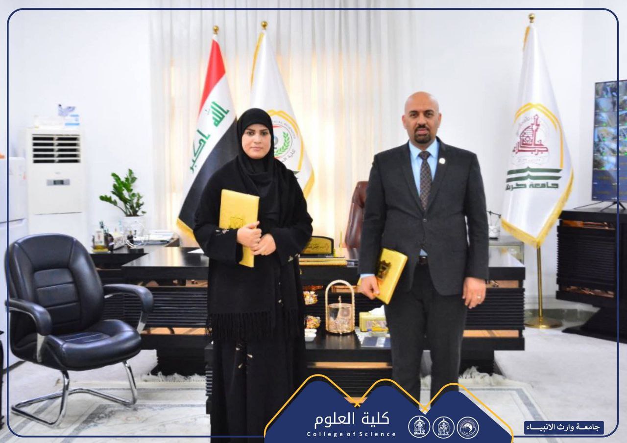 Within the framework of strengthening academic collaboration and the exchange of scientific expertise, Assistant Professor Dr. Shaimaa Hussein Nawfal, Dean of the College of Science at the University of Warith Al-Anbiyaa (peace be upon him), signed a scientific twinning agreement with Assistant Professor Dr. Hassan Faisal Neama Al-Yasiri, Dean of the College of Applied Medical Sciences at the University of Karbala.